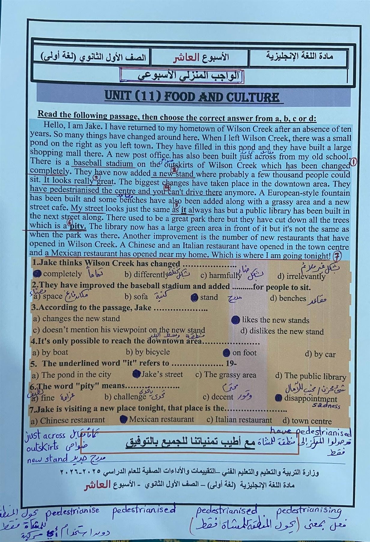 - تقييم الأسبوع العاشر إنجليزي أولى ثانوي