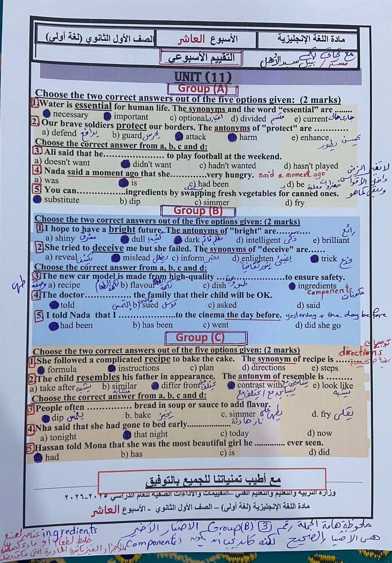 تقييم الأسبوع العاشر إنجليزي أولى ثانوي.. وفي هذا السياق، نقدم مراجعة متكاملة تتضمن الإجابات النموذجية لأهم الأسئلة التي وردت في تقييم الأسبوع العاشر، بما يساعد الطلاب على استيعاب القواعد اللغوية والتراكيب بشكل أفضل، إلى جانب تنمية مهارات الترجمة والفهم.