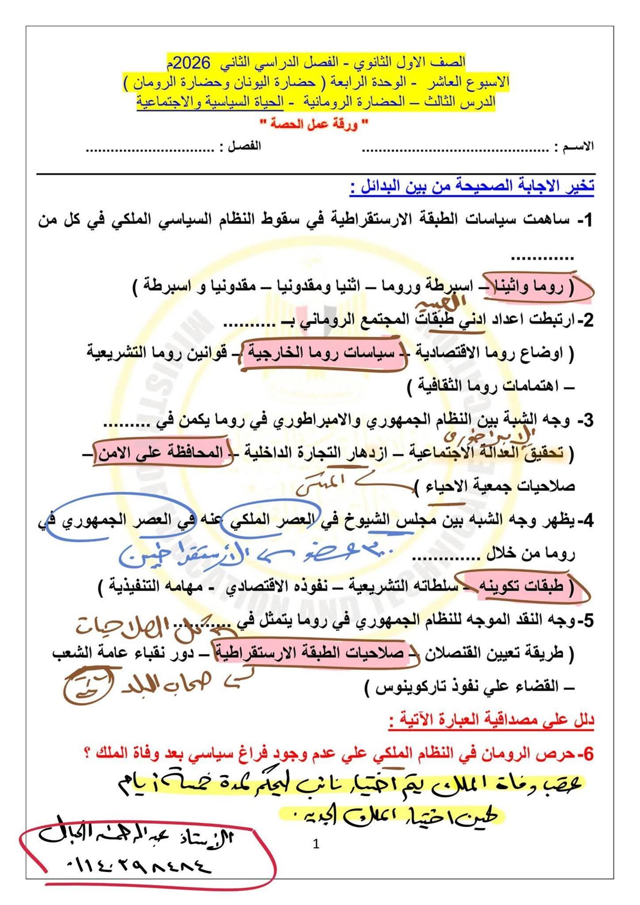 - مراجعة شاملة تاريخ أولى ثانوي أسبوع 10