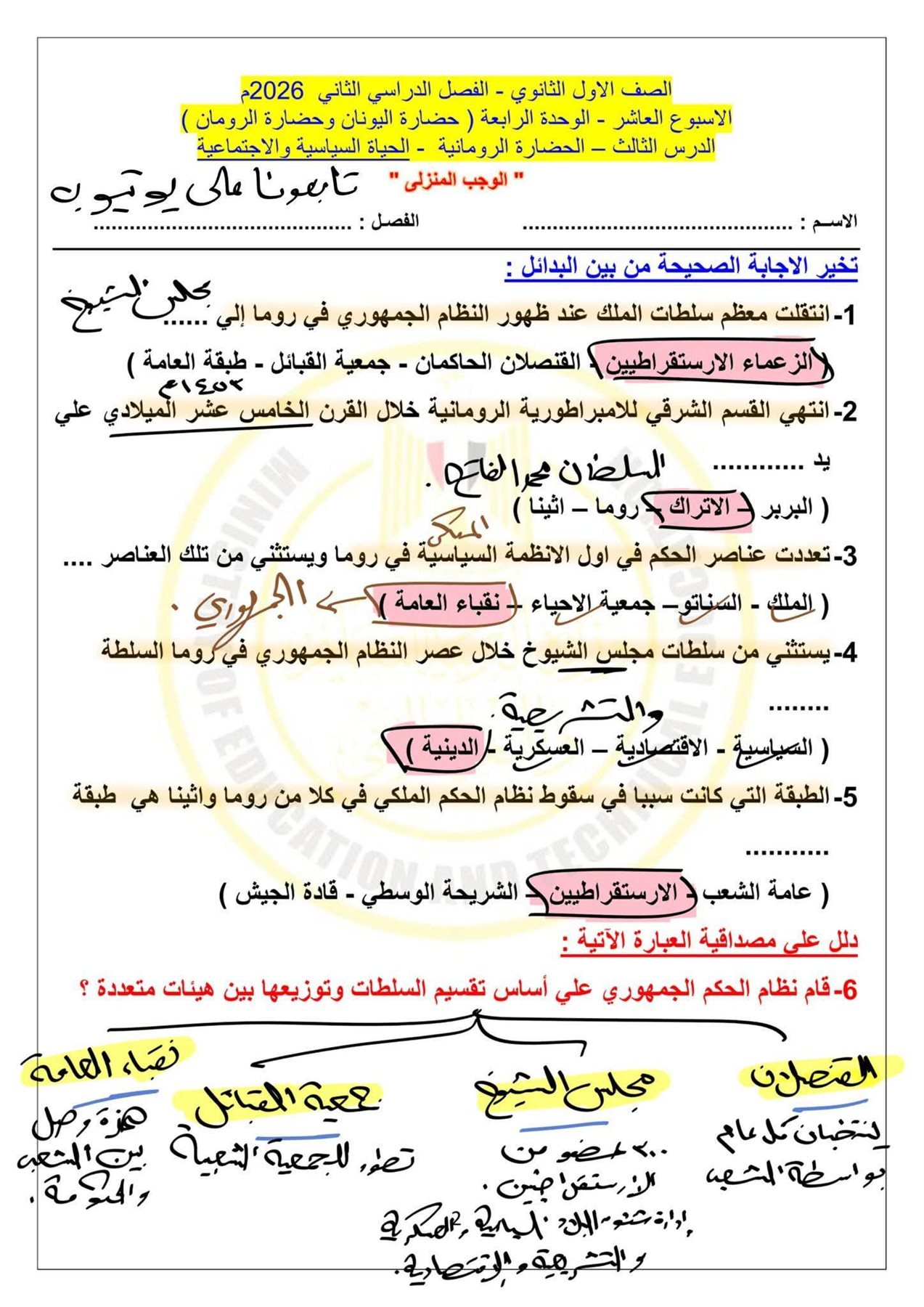 - إجابات التاريخ أولى ثانوي الترم الثاني 2026