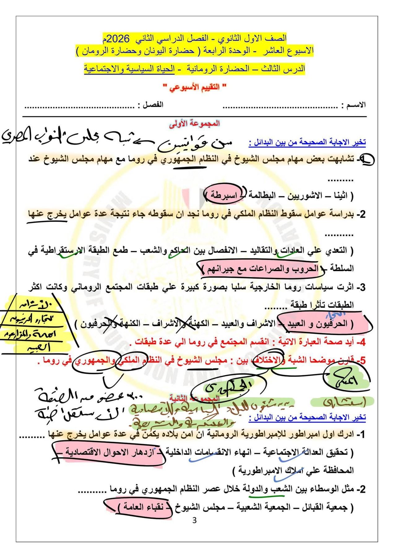 مراجعة شاملة وحل تقييم الأسبوع العاشر تاريخ أولى ثانوي