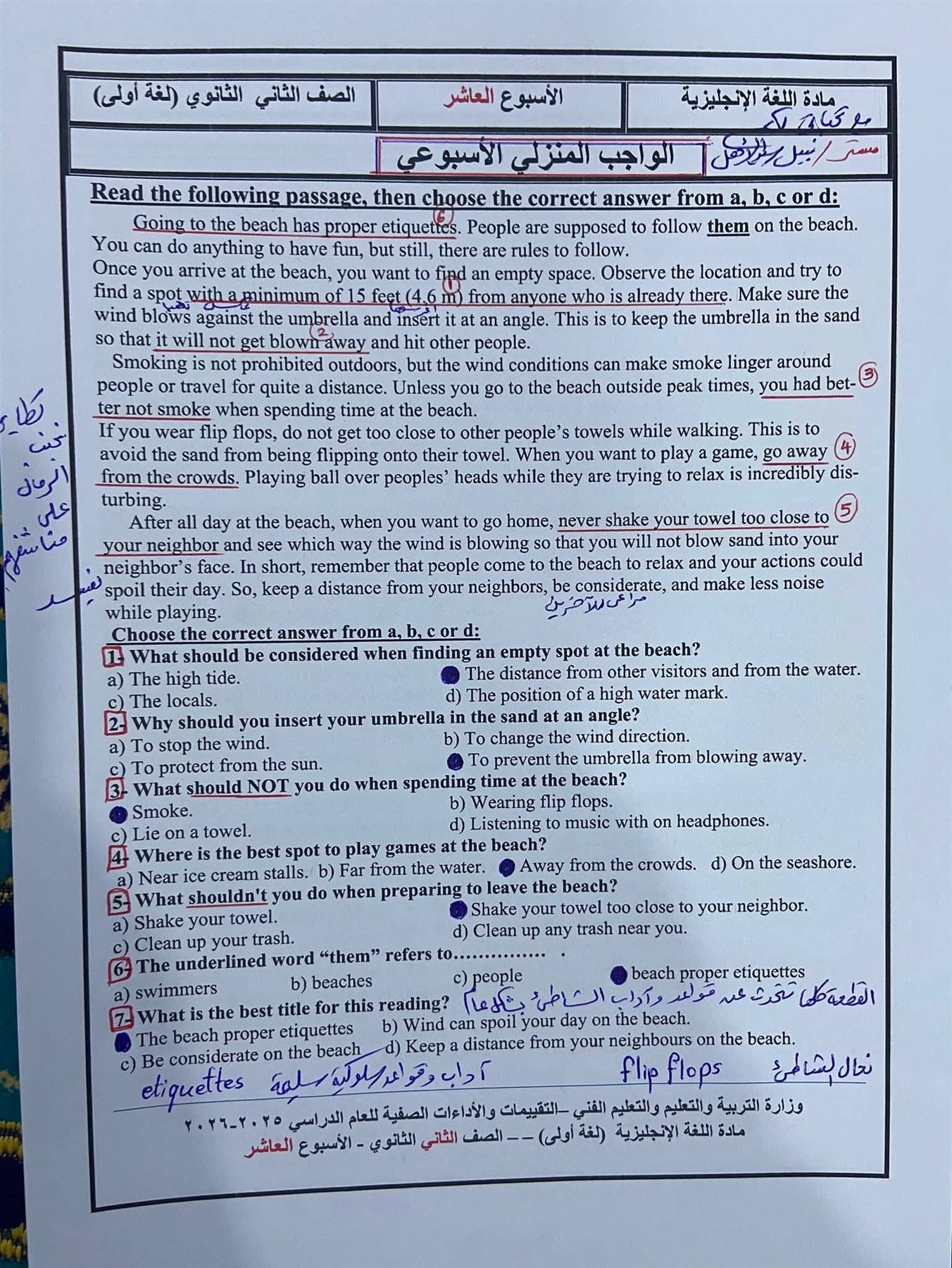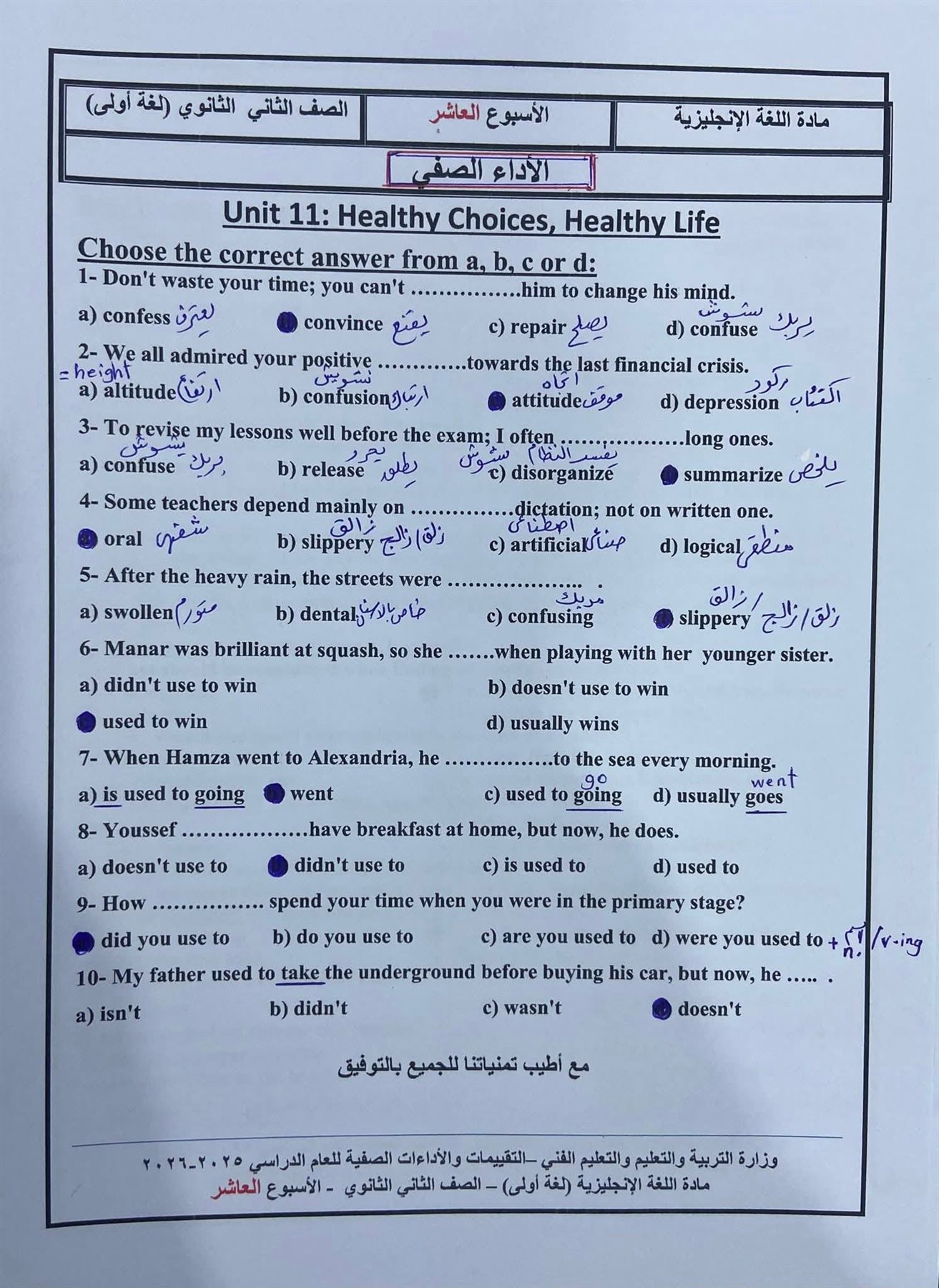 - تقييم الأسبوع العاشر إنجليزي ثانية ثانوي ترم ثاني 2026