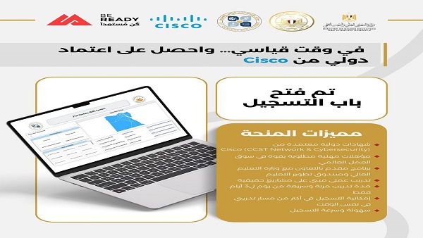 يعلن صندوق تطوير التعليم التابع لرئاسة مجلس الوزراء (صندوق تطوير التعليم بالوزراء) عن إطلاق واحدة من أبرز مبادرات المنحة التدريبية المجانية بالتعاون مع شركة سيسكو العالمية، ضمن مبادرة كن مستعدًا، حيث يتم توفير 300 فرصة تدريبية موجهة إلى طلاب الجامعات والخريجين بهدف تعزيز تأهيل الشباب لسوق العمل ورفع جاهزيتهم في مجالات التكنولوجيا الحديثة.