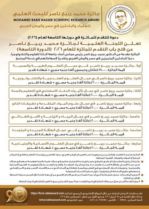 فتح باب الترشح لـ جائزة الدكتور محمد ربيع ناصر للبحث العلمي 2026 فى دورتها التاسعة