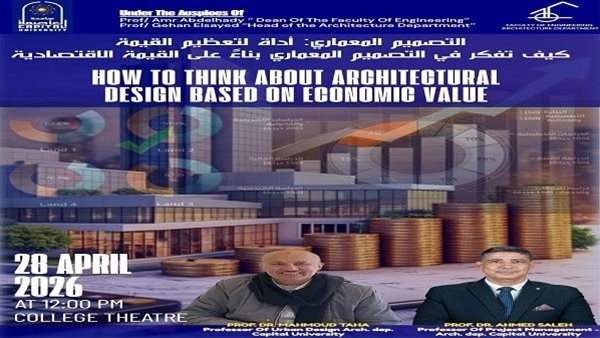 تدعو جامعة العاصمة جميع طلاب وخريجي كلية الهندسة بالمطرية والمهتمين بمجالات الهندسة المعمارية والتصميم المعماري والتصميم العمراني إلى حضور هذه الندوة العلمية، والاستفادة من محتواها المتخصص الذي يعزز فهم القيمة الاقتصادية للتصميم المعماري ويدعم مسار التعليم الهندسي الحديث داخل جامعة العاصمة.