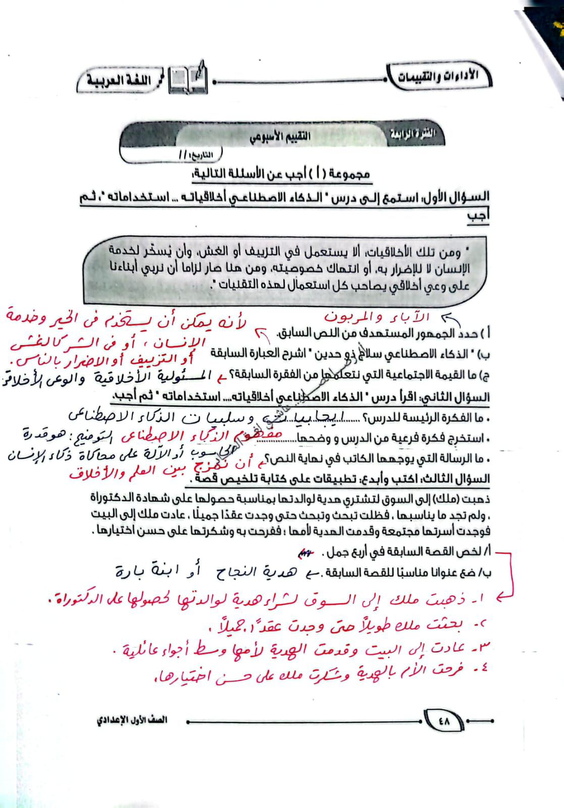 - الصف الأول الإعدادي اللغة العربية ترم ثاني