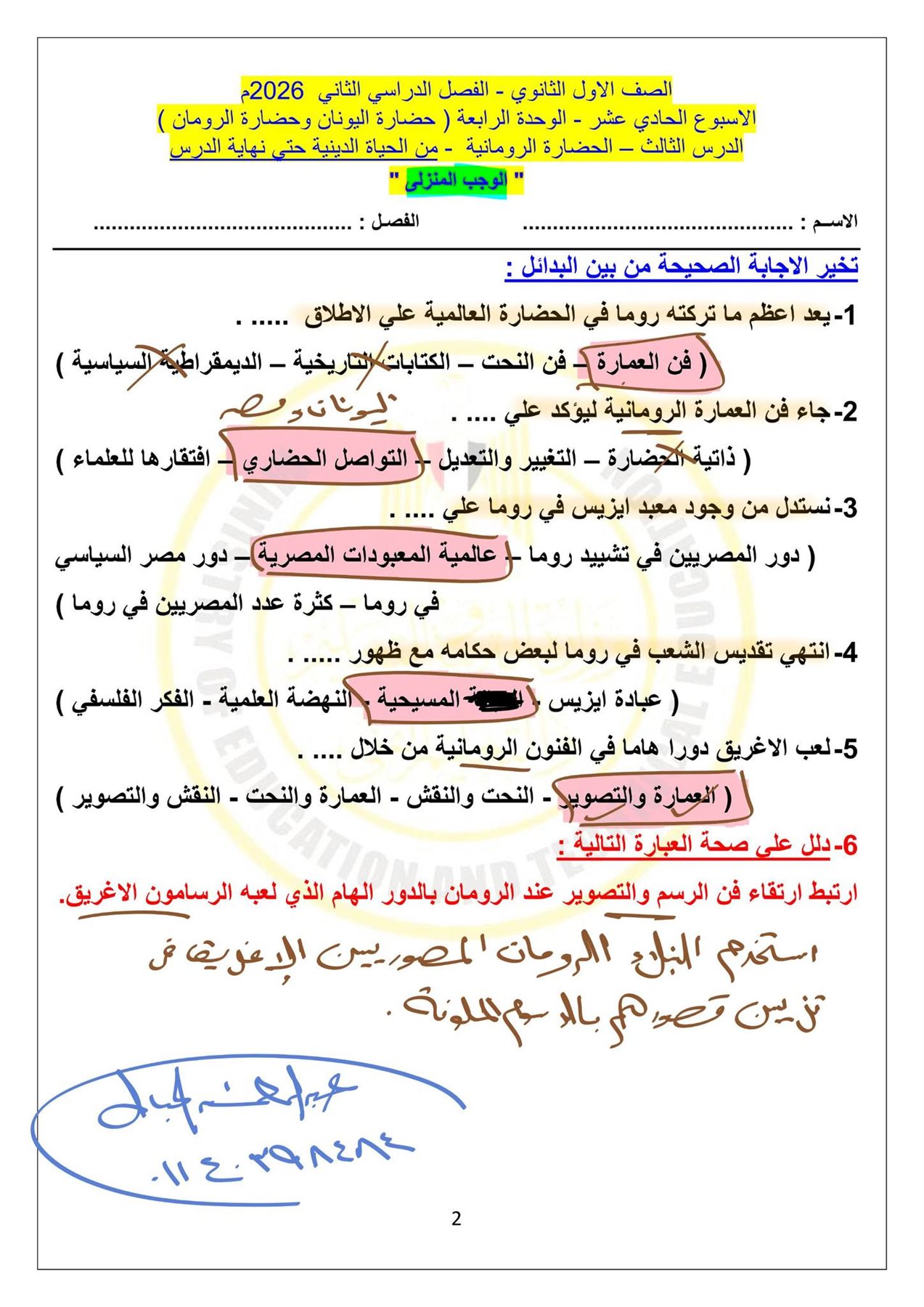 - إجابات التاريخ أولى ثانوي الترم الثاني 2026