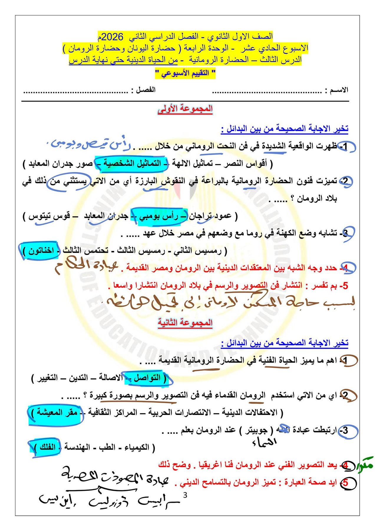 - تقييمات وزارة التربية والتعليم تاريخ أولى ثانوي