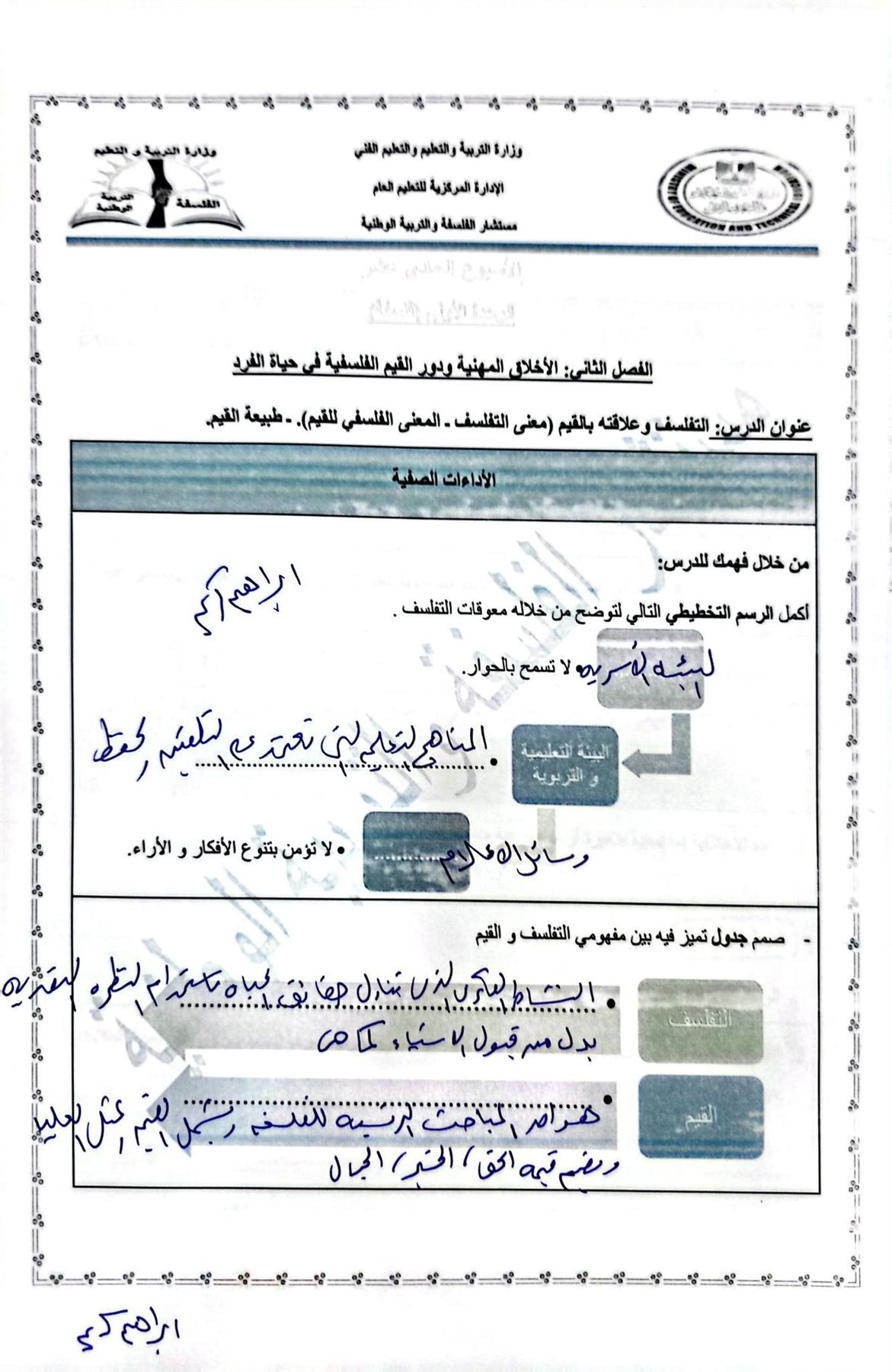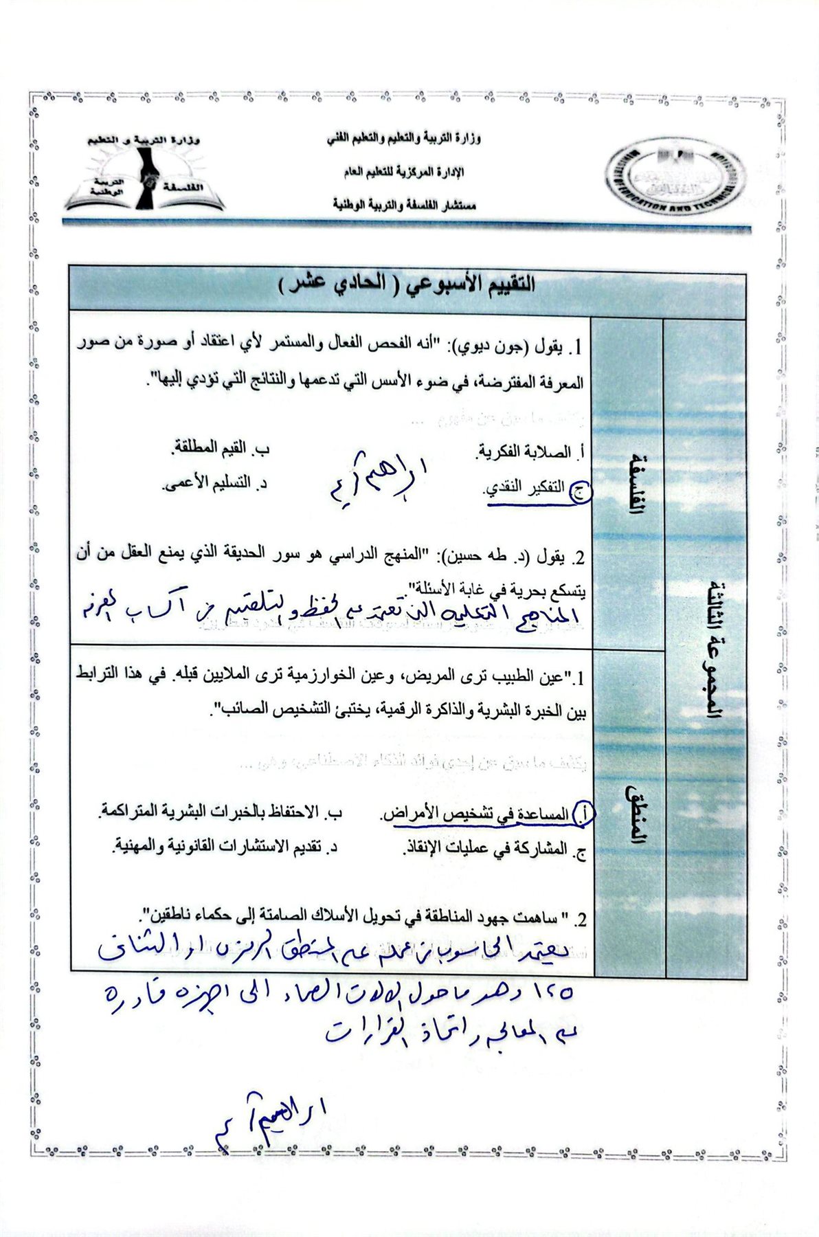 - التقييم الاسبوعي للصف الأولى الثانوي الفلسفة والمنطق