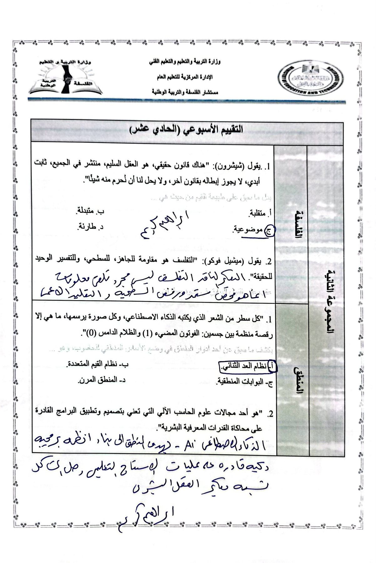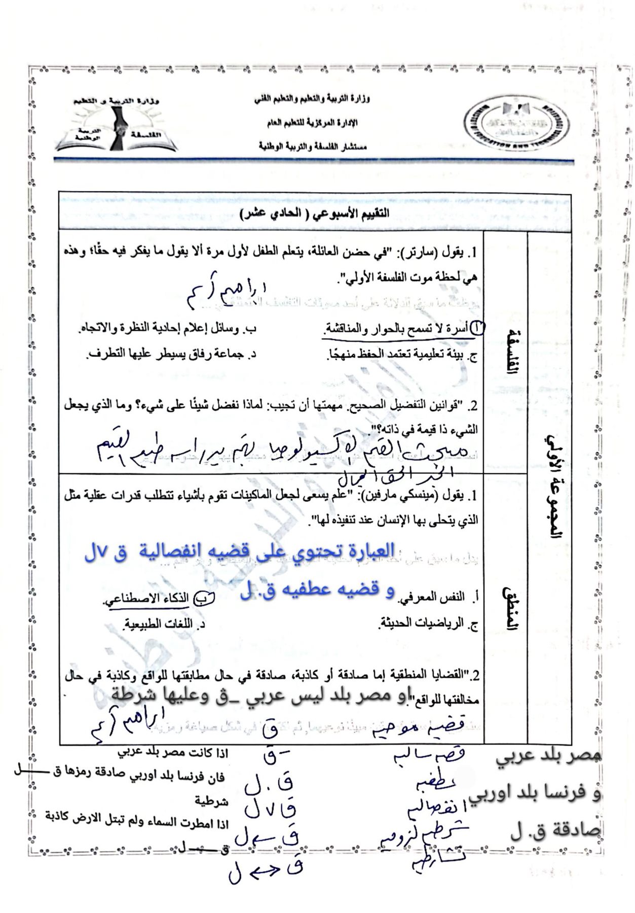- التقييم الاسبوعي للصف الأول الثانوي الفلسفة والمنطق