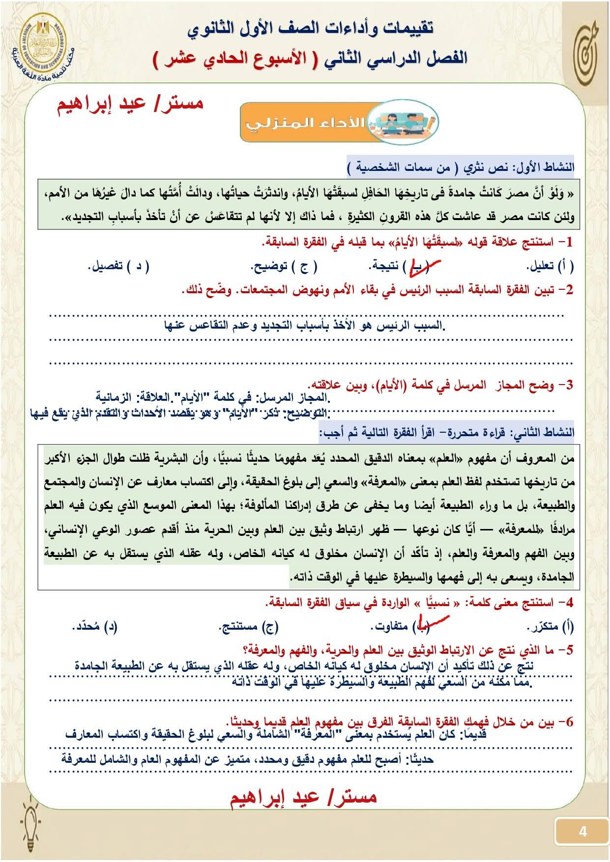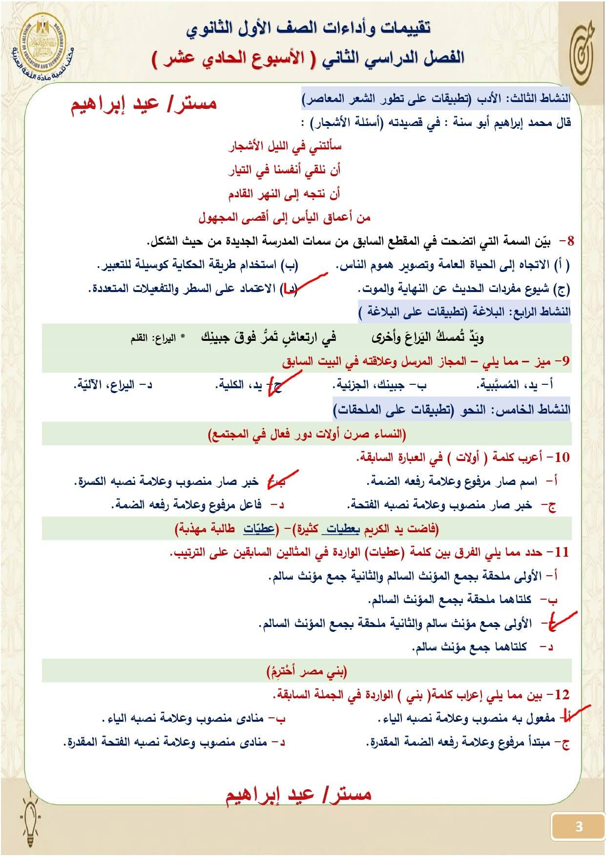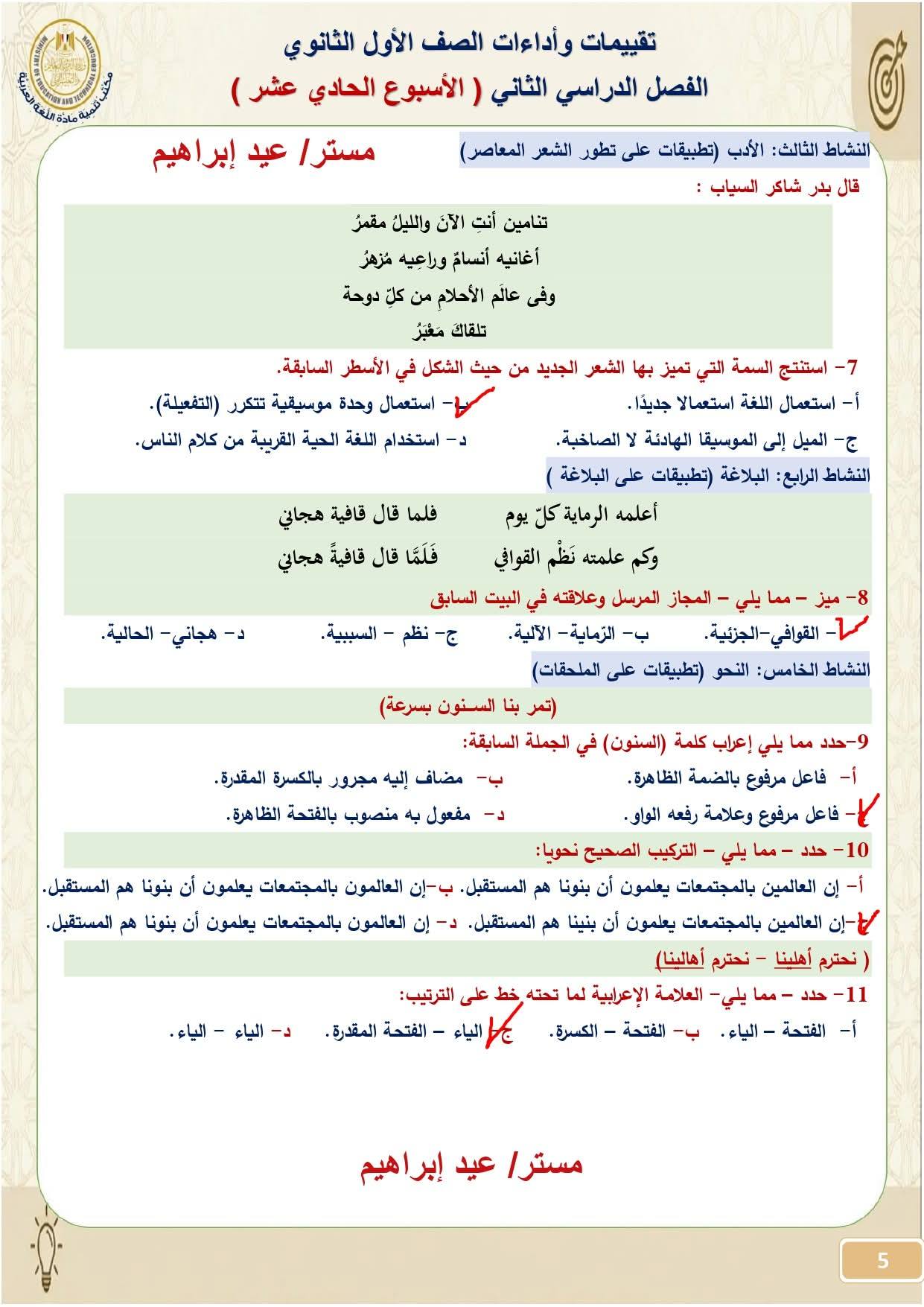 - إجابة تقييم الأسبوع 11 عربي صف أول ثانوي ترم ثاني