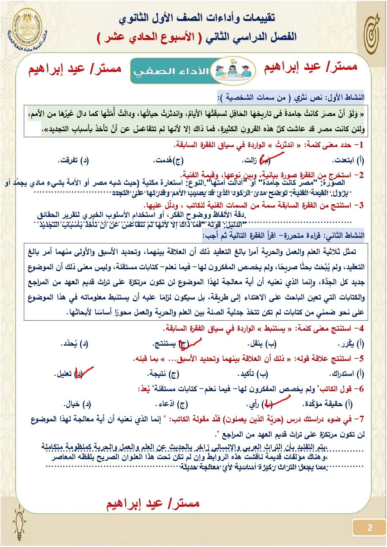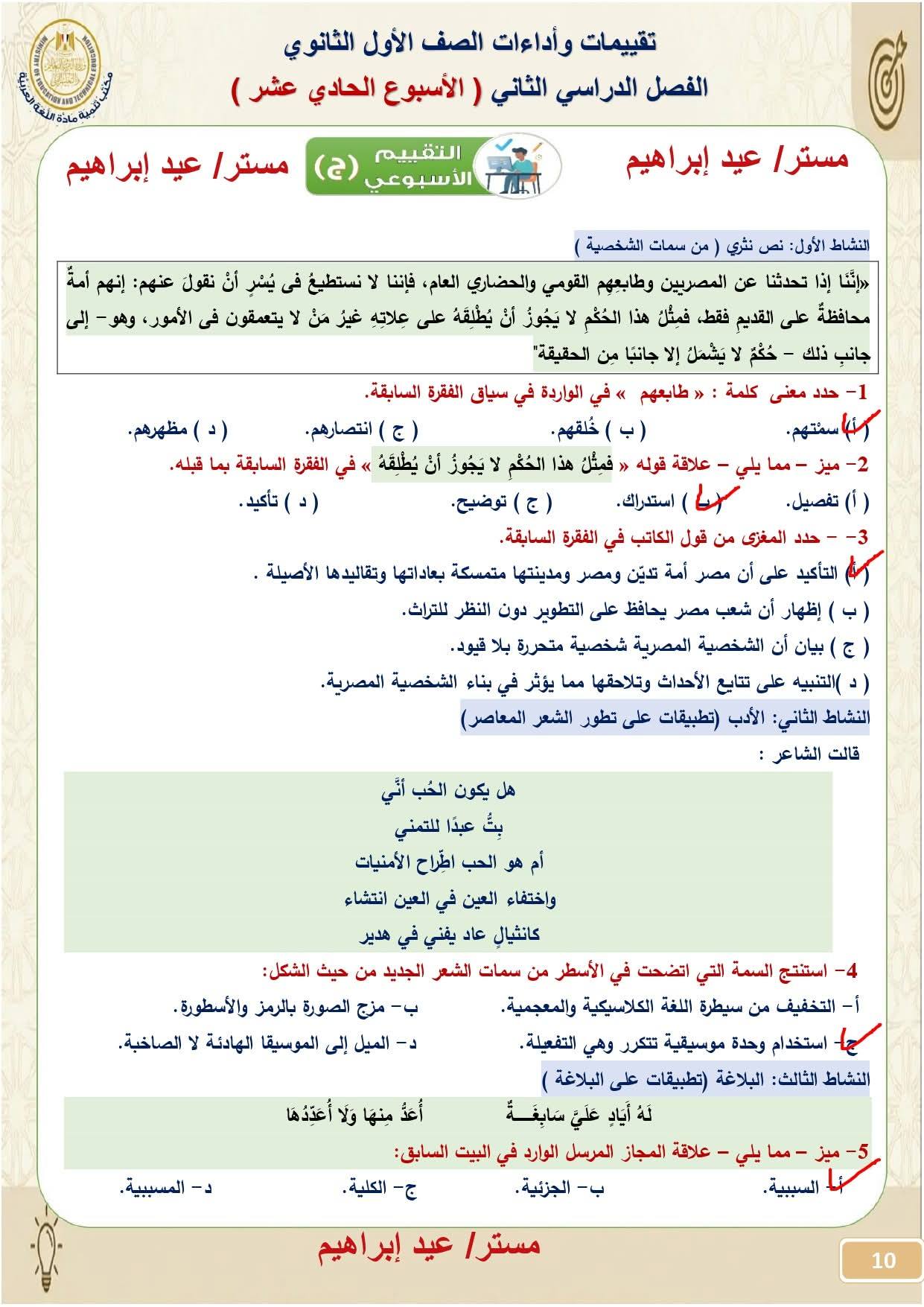 الإجابة النموذجية تقييم الأسبوع العاشر عربي أولى ثانوي ترم ثاني