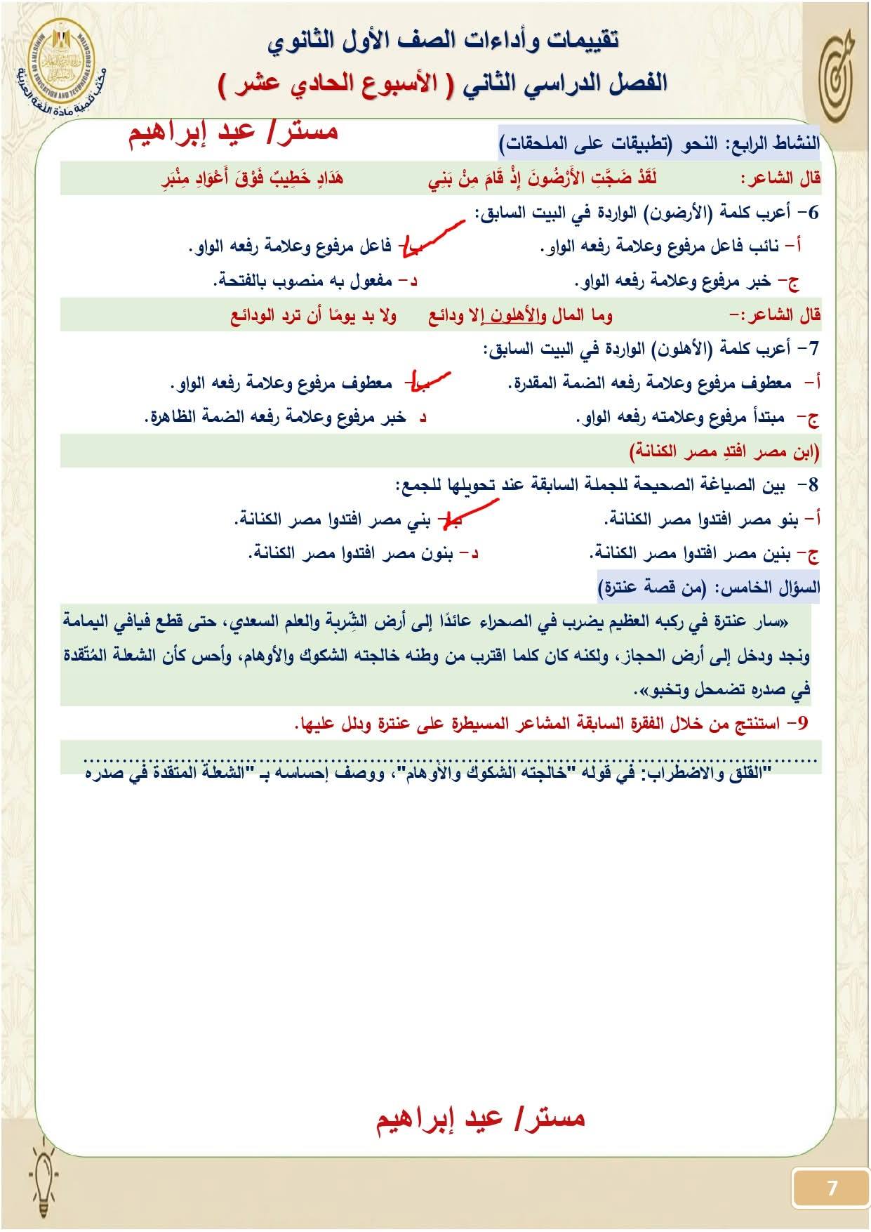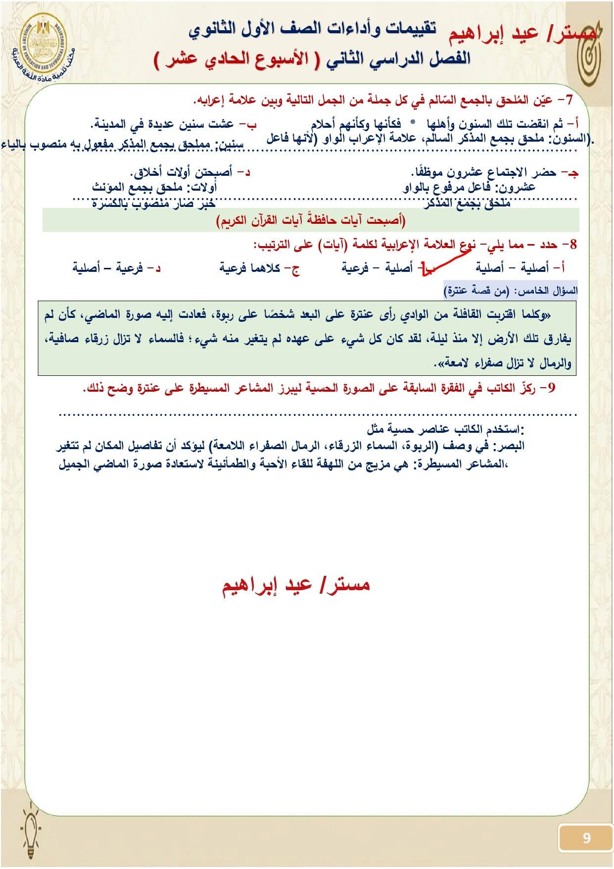 - تقييمات وزارة التربية والتعليم عربي أولى ثانوي