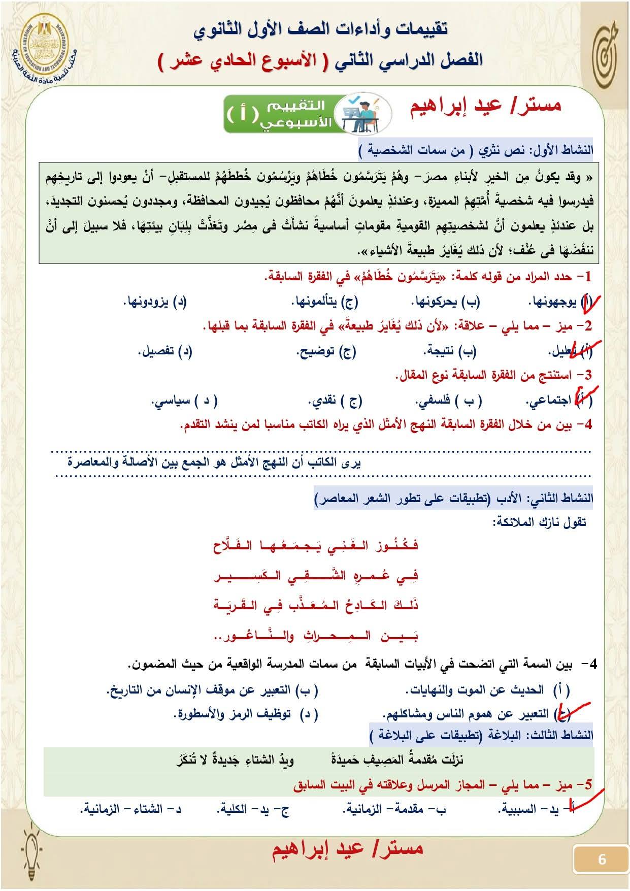 - حل أسئلة التقييم الأسبوعي لغة عربية