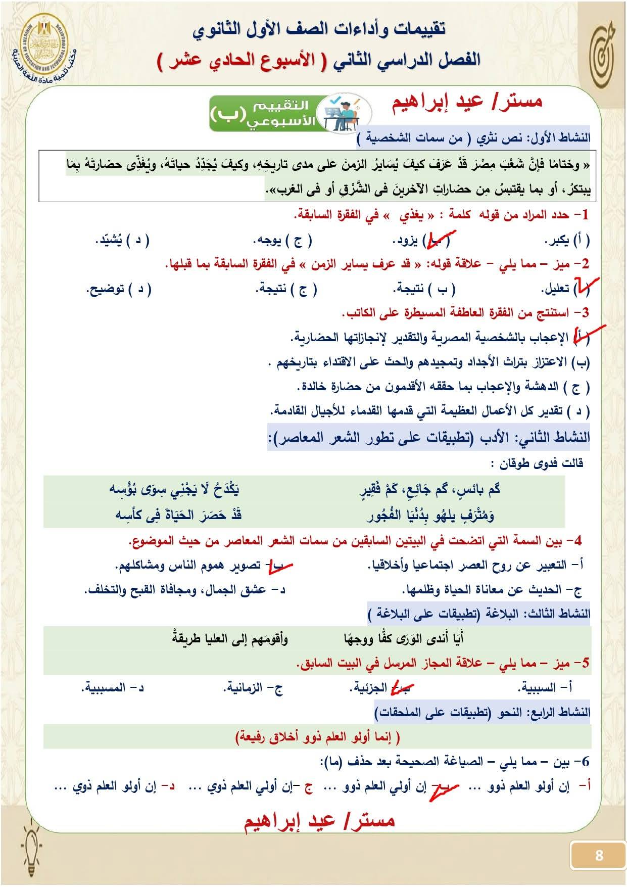 حل تقييم الأسبوع الـ 11 اللغة العربية.. يتضمن تقييم هذا الأسبوع مجموعة من الأسئلة المتنوعة التي تغطي أجزاء المنهج المقررة خلال هذه الفترة، وتحديدًا في فروع (النصوص، الأدب، البلاغة، والنحو)، حيث يركز التقييم على قياس نواتج التعلم والفهم العميق بدلًا من الحفظ والتلقين، تماشيًا مع نظام التقييم الجديد للمرحلة الثانوية.