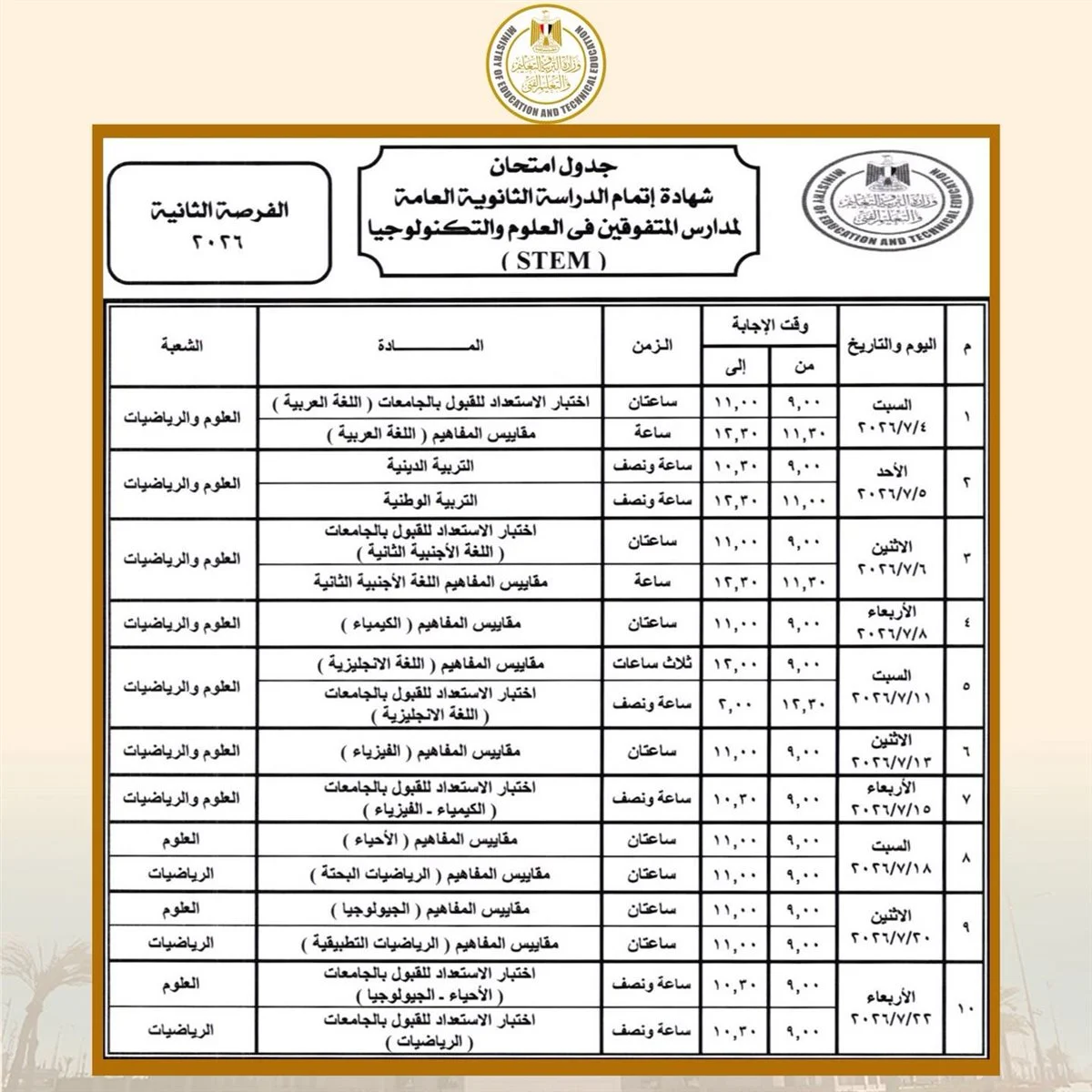 جدول امتحانات الثانوية العامة 2026.. المواعيد الكاملة رسميًا