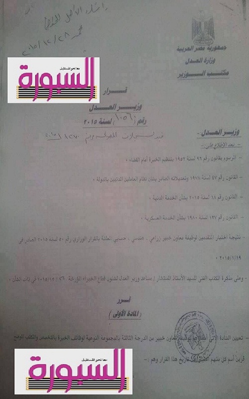 بناء على قرار وزير العدل 10560 لسنة 2015، يتم تعيين الساده الاتى اسمائهم بوظيفة "معاون خبير" من الدرجة الثالثة بالمجموعة النوعية لوظائف الخبرة بالتخصص.