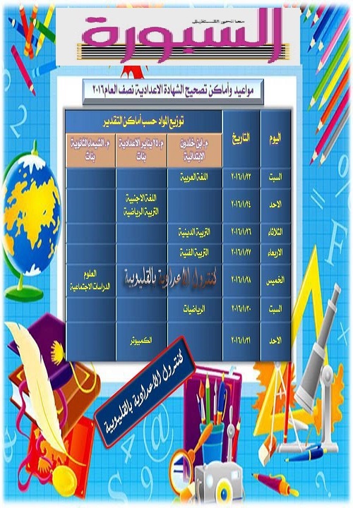 ينشر موقع "السبورة التعليمى" مواعيد وأماكن تصحيح مواد الشهادة الاعدادية بالقليوبية، للفصل الدراسى الأول لعام 2016/2015، والتى سوف تبدأ اعمال التصحيح يوم السبت 22 يناير وتنتهى يوم الأحد 31 يناير 2016.
