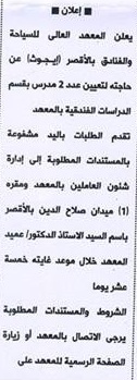 يعلن المعهد العالى للسياحة والفنادق بالاقصر عن حاجته لاعضاء هيئة تدريس بقسم الدراسات الفندقية، على أن تقدم الطلبات باليد بالمستندات المطلوبة الى ادارة شئون العاملين بالمعهد ومقره ميدان صلاح الدين بالاقصر باسم السيد الاستاذ الدكتور عميد المعهد خلال موعد غايته خمسة عشر يوما.