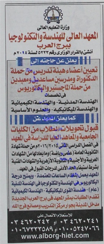 يعلن المعهد العالي للهندسة والتكتولوجيا ببرج العرب عن حاجتة لتعيين أعضاء هيئة تدريس من حملة الدكتوراة ومدرسين مساعدين ومعيدين من حملة الماجستير والبكالوريوت وذلك في التخصصات التالية: