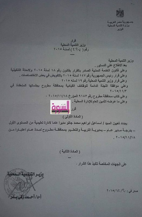 أصدر الدكتور احمد ذكي بدر وزير التنمية المحلية القرار رقم 437 لسنة 2015 والذي يفيد بتجديد تعيين إسماعيل ابراهيم محمد جاتو مديرا عاما لإدارة مطروح التعليمية من المستوي الأول بدرجة مدير عام لمدة عام .
