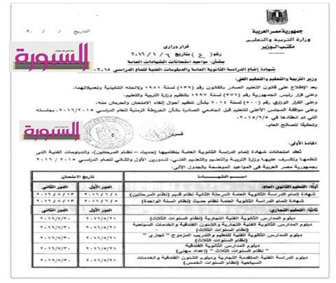 وتضمن القرار في المادة الاولي : تعقد امتحانات شهادة اتمام الدراسة الثانوية العامة، بنظاميها والدلومات الفنية للدورين الاول والثاني، للعام الدراسي 2015/2016 في المواعيد التالية :