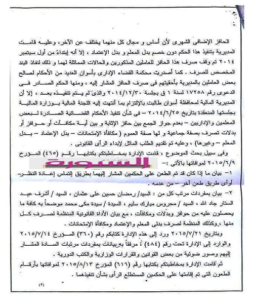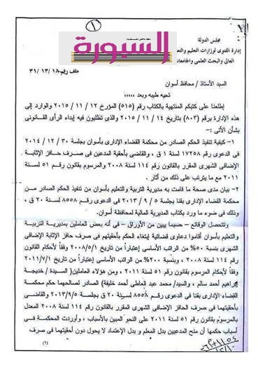 ننشر رد ادارات الفتوى لادارات التعليم والتعليم العالى والبحث العلمى والجامعات بشأن قواعد تنفيذ صرف احكام حافز الاثابة بمديرية التربية والتعليم بأسوان بعد رفع مجموعة من العاملين بمديرية التربية والتعليم دعاوى قضائية لصرف حافز الاثابة وقدره 50 % من الراتب الاساسى من 1 / 5 / 2008 وفقا لاحكام القانون رقم 114 لسنة 2008 وبنسبة 20% من الاساسى اعتبارا من 1 / 7 / 2011 وفقا لاحكام المرسوم بقانون رقم 51 لسنة 2011 وتح الحصول بالفعل على حكم قضائى لاصحاب الدعوى حيث اوردت المحكمة فى اسباب حكمها ان منح الداعين بدل الاعتماد وبدل المعلم لايمنع حصولهم على الحافز الشهرى الاضافى وقاتمت المديرية بتنفيذ الحكم .