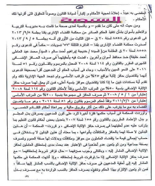 احقية صرف حافز الاثابة الاضافى بنسبة 50 % من المرتب الاساسى وفقا لأحكام القانون 114 لسنة 2008 اعتبارا من 1 / 5 / 2008 ثم صرف الحافز بنسبة 200 % من الراتب الاساسى اعتبارا من 1 / 7 2011 والزمت مديرية التربية والتعليم بأسوان بالالتزام باستمرار تنفيذ الحكم الصادر فى 30 / 12 / 2014