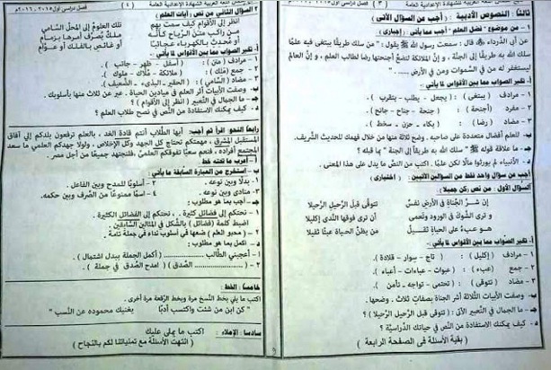 اسئلة امتحان اللغة العربية لاعدادية القاهرة