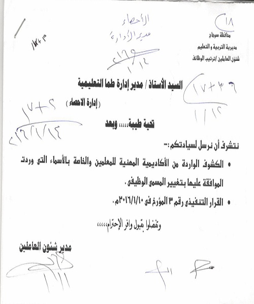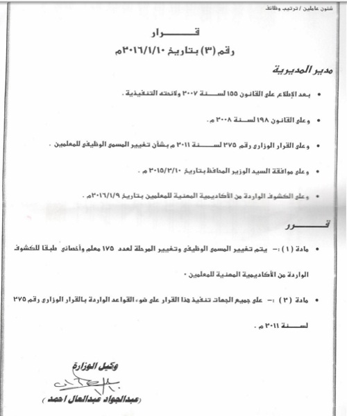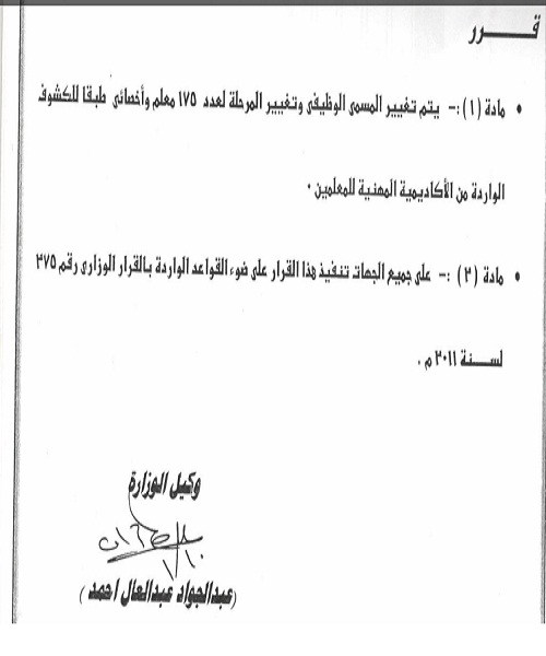 بالمستندات| ننشر اسماء المعلمين الذين تم تغيير المسمى الوظيفى لهم
