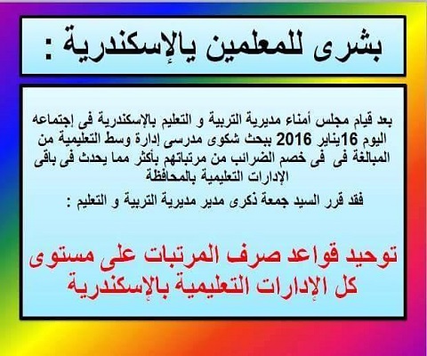 وافق مجلس امناء مديرية التربية والتعليم بالاسكندرية فى اجتماعه ببحث شكوى مدرسى ادارة وسط التعليمية من المبالغة فى خصم الضرائب من مرتباتهم بأكثر مما يحدث فى باقى الادارات التعليمية بالمحافظة، فقرر جمعة ذكرى مدير مديرية التربية والتعليم توحيد قواعد صرف المرتبات على مستوى كل الادارات التعليمية بالاسكندرية.