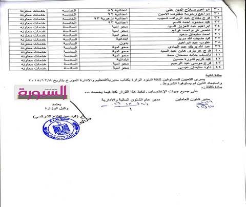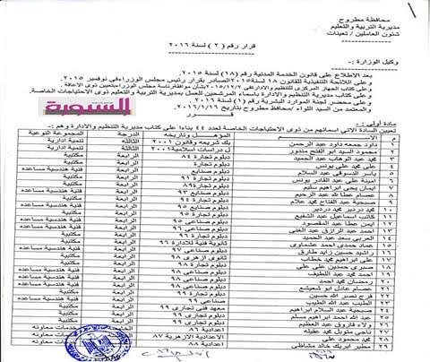 اصدر الدكتور محمد الشركسي، وكيل وزارة التربية والتعليم بمطروح، القرار رقم 2 لسنة 2016 بشأن تعيين 44 من ذوي الاحتياجات الخاصة وفقاٌ للكشوف المرفقة وذلك بعد موافقة التنظيم والادارة.