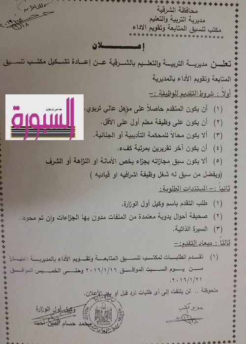 تعلن مديرية التربية والتعليم بالشرقية عن اعادة تشكيل مكتب تنسيق المتابعة وتقويم الاداء بالمديرية.