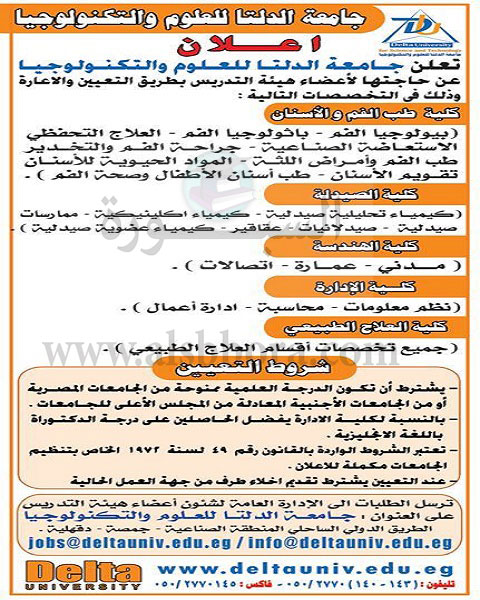 اعلنت جامعة الدلتا للعلوم والتكنولوجيا عن حاجتها لاعضاء هئية تدريس معاونة بطريق التعيين أو الاعارة في كليات طب الفم والاسنان ، الصيدلة ، الادارة ، العلاج الطبيعي ، في محتلف التخصصات ننشر الشروط والتفاصيل
