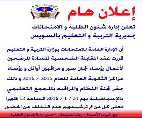 تعلن ادارة شئون الطلبة والامتحانات بمديرية التربية والتعليم بالسويس بإن الادارة العامة للامتحانات بوزارة التربية والتعليم قررت عقد المقابلة الشخصية للسادة المرشحين لاعمال رؤساء لجان سير ومراقبين أوائل ورؤساء مراكز الثانوية العامة للعام 2016/2015، وذلك بمقر لجنة النظام والمراقبة بالمجمع التعليمى بالاسماعيلية يوم 31 يناير فى تمام الساعة الثانية عشر ظهرا فعلى كل من تم ترشيحهم عدم التخلف عن الحضور.