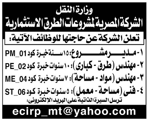 تعلن وزارة النقل عن حاجتها لشغل عدد من الوظائف للشركة المصرية لمشروعات الطرق الاسثمارية حسب التخصصات والشروط الواردة لكل وظيفة واللازمة للعمل بها كالتالى: