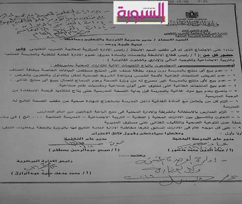 أوصت الادارة العامة للمدرسة المنتجة بوزارة التربية والتعليم في فاكس ارسلتة الي المديريات بإستخراج شهادة صحية لمن يتعامل مع المادة الغذائية والاستعانة بالشرطة لمنع الباعة الجائلين امام المدارس .