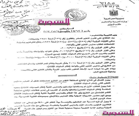 ينشر موقع "السبورة التعليمى" القرار الوزاري رقم 562 لسنة 2014 بشأن تنظيم التقدم من الخارج لامتحانات النقل او امتحانات دبلوم مدارس التعليم الفني، والكتب الدورية المنظمة له.
