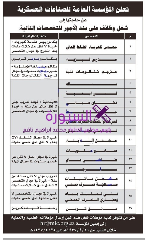 تعلن المؤسسة العامة للصناعات العسكرية بالسعودية تعلن عن وظائف شاغرة لخريجي الجامعات وذلك وفقا للتخصصات التالية: