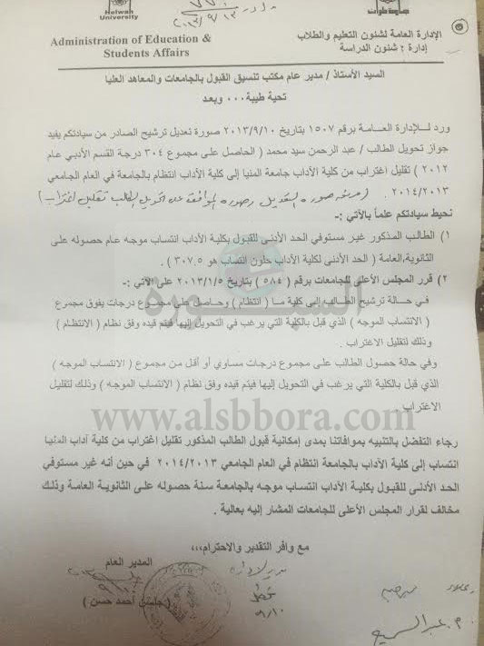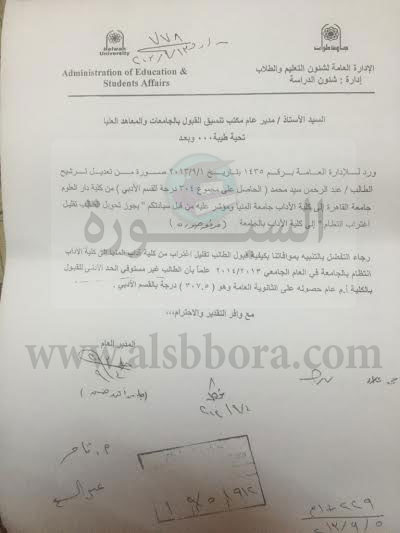 جامعة عين شمس مبدية تعجبها من إصرار مدير مكتب التنسيق على قبول الطالب المذكور بصورة