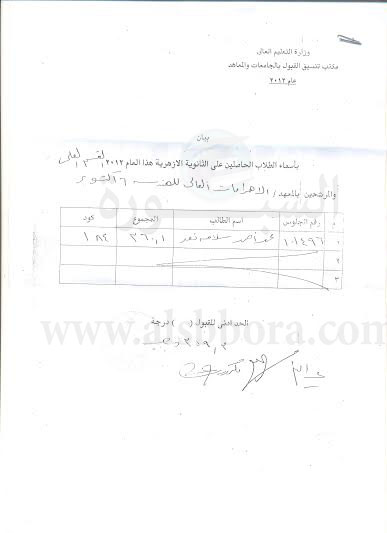 نصر ثانوية أزهرية عام 2012 القسم العلمى يدويا عن طريق مدير مكتب التنسيق إلى معهد