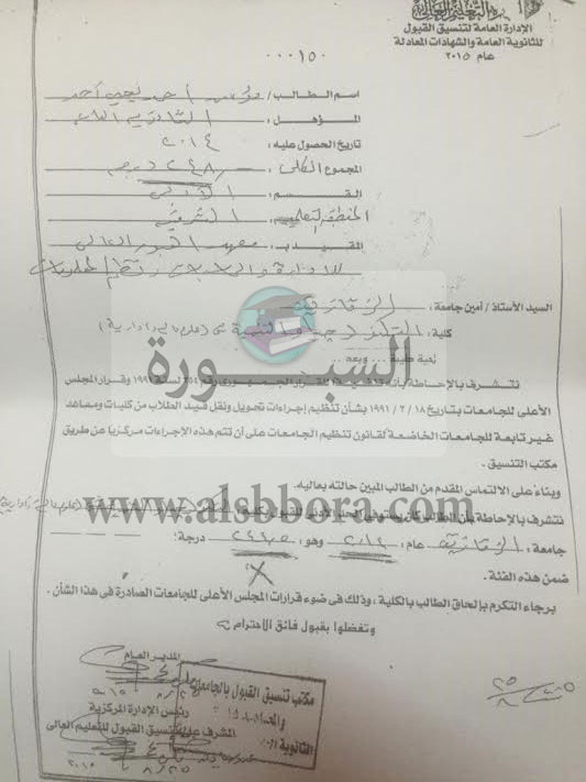 وقام مدير عام مكتب التنسيق بختم صورة من شهادة الطالب