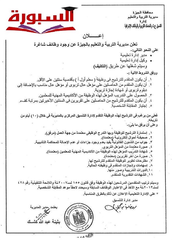 مديرية التربية والتعليم بالجيزة تعلن عن وظائف شاغرة طالع نص الاعلان