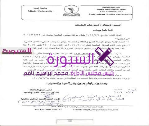 قام الدكتور السيد ابراهيم، نائب رئيس جامعة المنيا لشئون الدراسات العليا والبحوث، بتمديد الفترة الخاصة بتلقي الترشيحات الخاصة بجوائز الجامعة للعام 2015/2016 للموظف المثالى على مستوى ادارات الجامعة والامن الجامعىي والعامل المثالى حتي يوم الاحد 28/2/2016.