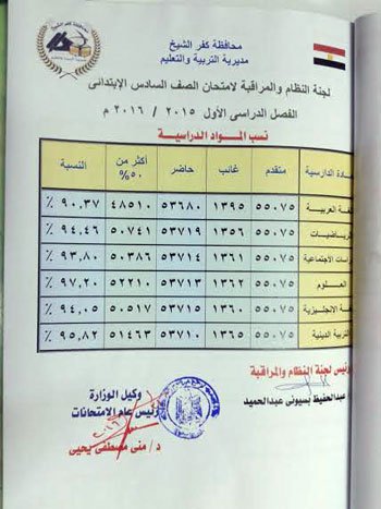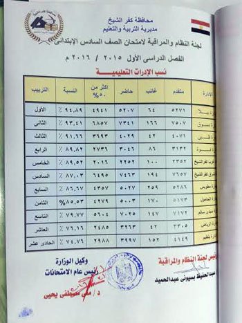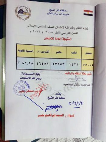 قام اللواء السيد إبراهيم نصر، محافظ كفر الشيخ باعتماد نتيجة الترم الأول لامتحانات الصف السادس الابتدائى، بحضور الدكتورة منى مصطفى وكيل وزارة التربية والتعليم بكفر الشيخ بنسبة 86,85% .