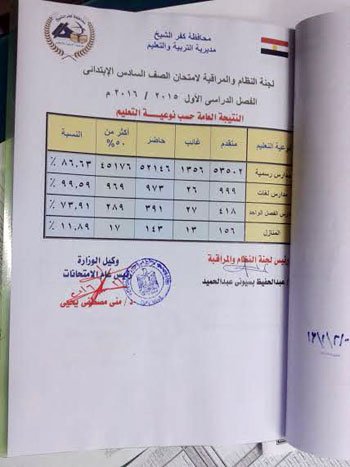 بكفر الشيخ، إن عدد المتقدمين 55 ألفا و75 تلميذا وتلميذة، تغيب منهم 1422 تلميذا،