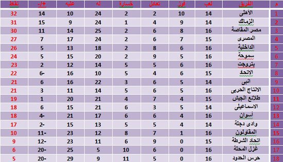 جدول ترتيب فرق الدورى المصرى للأسبوع السادس عشر 2015/2016