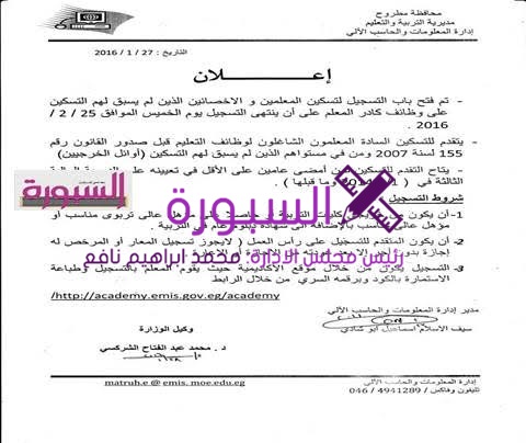 اعلنت مديرية التربية والتعليم بمطروح، عن فتح باب التسجيل للمعلمين والاخصائيين على وظائف الكادر في موعد غايتة 25 فبراير لمن امضىي عامين على الاقل بتاريخ 1/1/2014 وما قبلها .