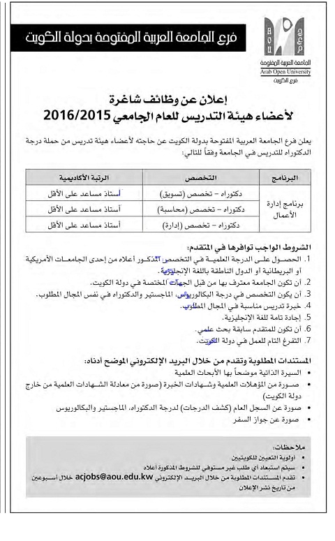 تعلن الجامعة العربية المفتوحة بالكويت عن وظائف شاغرة لأعضاء هيئة التدريس من حملة الماجستير والدكتوراه وذلك في التخصصات التالية :