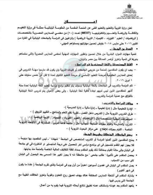 اعلنت وزارة التربية والتعليم والتعليم الفني عن المنحة المقدمة من الحكومة اليابانية ممثلة في وزارة التعليم والثقافة والعلوم والتكنولوجيا mext لـ10 من المعلمين المعينين بالمدارس المصرية، فى تخصصات الرياضيات، والعلوم، و الفيزياء، والكيمياء، والتربية الرياضية، الراغبين فى استكمال الدراسة بالجامعات اليابانية، فى الفترة من أكتوبر 2016 وحتى مارس 2018 ، بغرض تحسين المهارات، والمستوى المهني، على أن يفتح باب التقدم للمنحة من 4 فبراير الشهر نفسه.